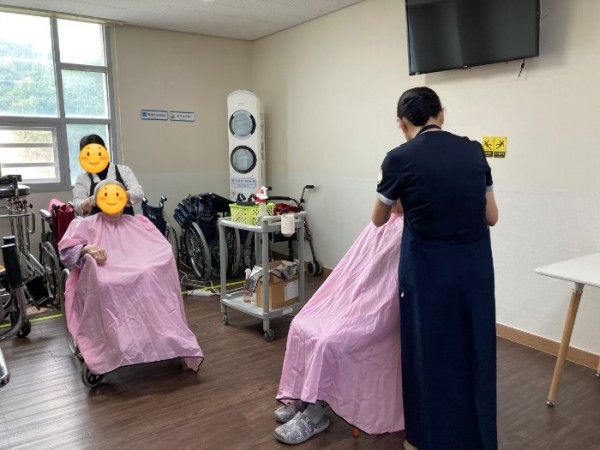 코로나 19 발생 후 외부 헤어샵 원장님들께서 내부로 출입이 금지되어 이.미용서비스가 중단 되면서 어려움이 많아졌지만 현재는 강남요양병원 내부 재능있는 직원들로 미용팀을 구성하여 최대한 환자분들의 의견에 맞춰 이.미용서비스를 진행해 드리고 있습니다.