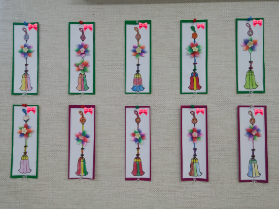 오늘의 프로그램은 노리개 도안에 색칙을 한 후 색종이를 접어 꾸미기 입니다.
