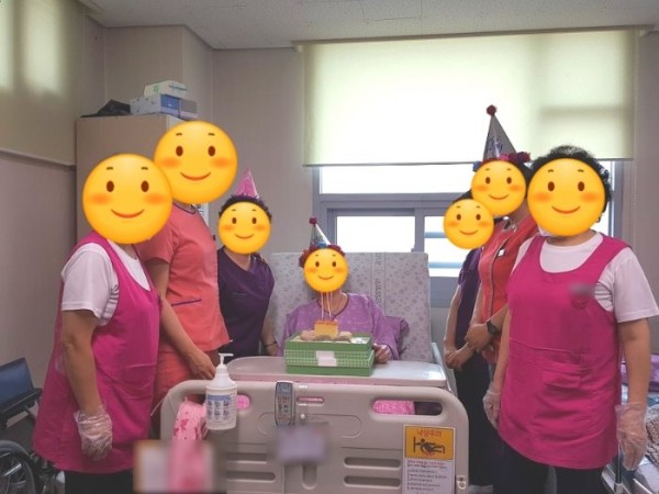 저희 강남요양병원에 입원중이신 어르신 가족분께서 생신 축하 떡 케이크를 보내주셨어요. 보내주신 케이크에 촛불도 꽂고 생신을 맞이하신 어르신 머리엔 고깔모자를 씌워드린 후 병동선생님들과 함께 생신축하송을 불러드렸어요. 갑작스럽 분위기에 당황하셨지만 매우 기뻐하셨어요. 진행하는 과정은 영상촬영 후 가족분에게 전송해 드렸어요.