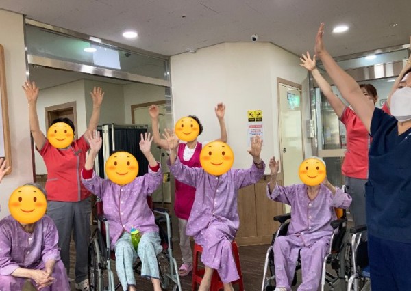 여가 프로그램 건강체조 진행으로 병동 분위기가 신났어요. 매주 화요일 병동별로 환우를 대상으로 전문강사와 함께 건강체조를 진행하고 있어요. 건강체조 도입 부분에 틀어 놓은 트로트에 병동 분위기는 무도회 장이 돼버렸어요. 반복되는 동작을 잘 따라 하시거나 노래를 부르며 호응해 주시는 것을 볼 수 있었으며 손과 발을 이용하여 신쳬활동을 함으로써 신체기능 유지에 도움이 되는 건강체조 전문 강사님 진행으로 더욱 즐거웠던 것 같아요.
