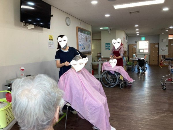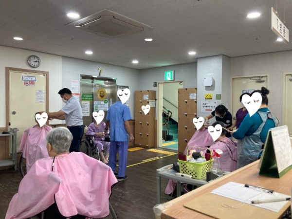입원중인 환우분들이 가장 기다리는 미용서비스가 진행되는 날. 병동별 정해진 날에 외부 미용 봉사자 및 내부 재능 있는 직원들과 진행하고 있어요. 몇년간 개인적인 사유로 단발머리를 고집하시던 어르신 오늘은 커트머리로 자르고 싶다는 커다란 결심으로 드디어 새로운 머리스타일로 자르셨어요. 머리가 가벼워져 기분이 좋으시다는 어르신 덕분에 진행하는 직원들도 기분좋은 날이 되어버렸답니다.